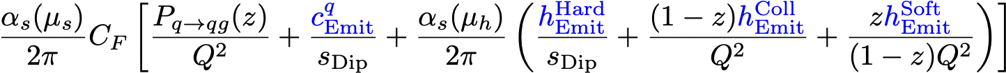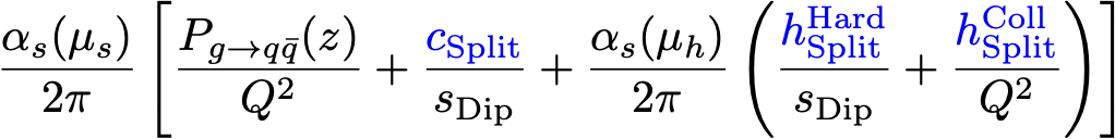 where μs is the standard renormalisation scale used for shower branchings and we take the scale for the second-order correction terms to be μh = mDip/4. The form used for the g→gg kernel is completely analogous to the one for q→qg above, with its own c coefficient but the same h coefficients.